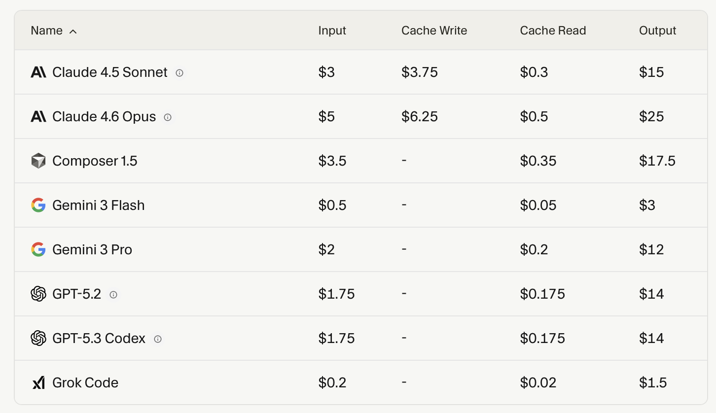 По цене Composer 1.5 находится примерно в середине среди топовых моделей для кодинга. Входные токены стоят $3.5, а выходные — $17.5, что делает его заметно дешевле, чем Anthropic Claude 4.6 Opus с $25 за output и немного дороже Claude 4.5 Sonnet. При этом Composer 1.5 ощутимо дороже универсальных моделей вроде Google Gemini 3 Pro или xAI Grok Code, но и ориентирован на более сложные сценарии с агентным поведением и долгими задачами.