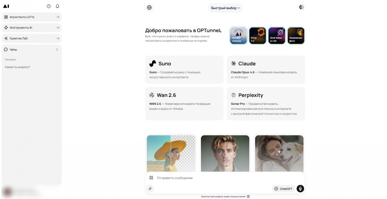 О денежках поговорили, так что же входит в функционал агрегатора? Кроме базового взаимодействия с моделями, GPTunnel имеет возможность работы с API, вариации заранее настроенных ассистентов и различные AI-инструменты.