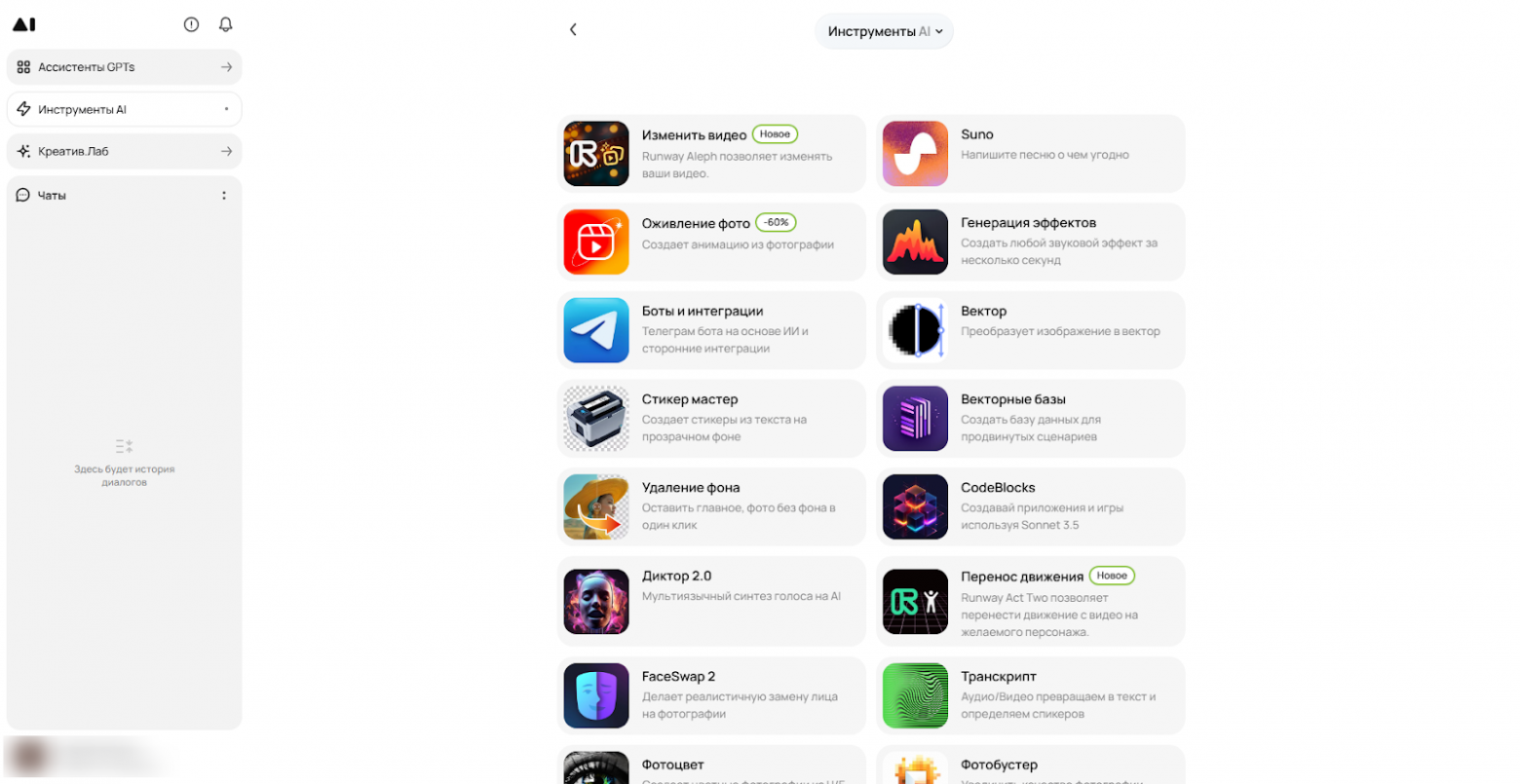 Агрегатор объединяет более 50 ИИ-моделей, для генерации текста, изображений и автоматизации контента. Да, каких-либо нейронок для взаимодействия с видео и аудио я не нашел.