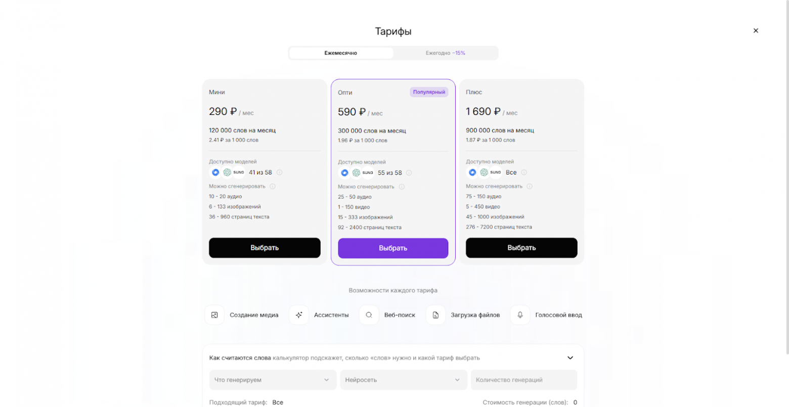 Про ценник. Тут опять же месячная подписка. Цены вроде и нормальные,но к ним еще несколько ограничений сверху. Однако не понятно, насколько хватит месячной подписки. В самих тарифах указаны примерные диапазоны количества генераций по разделам.