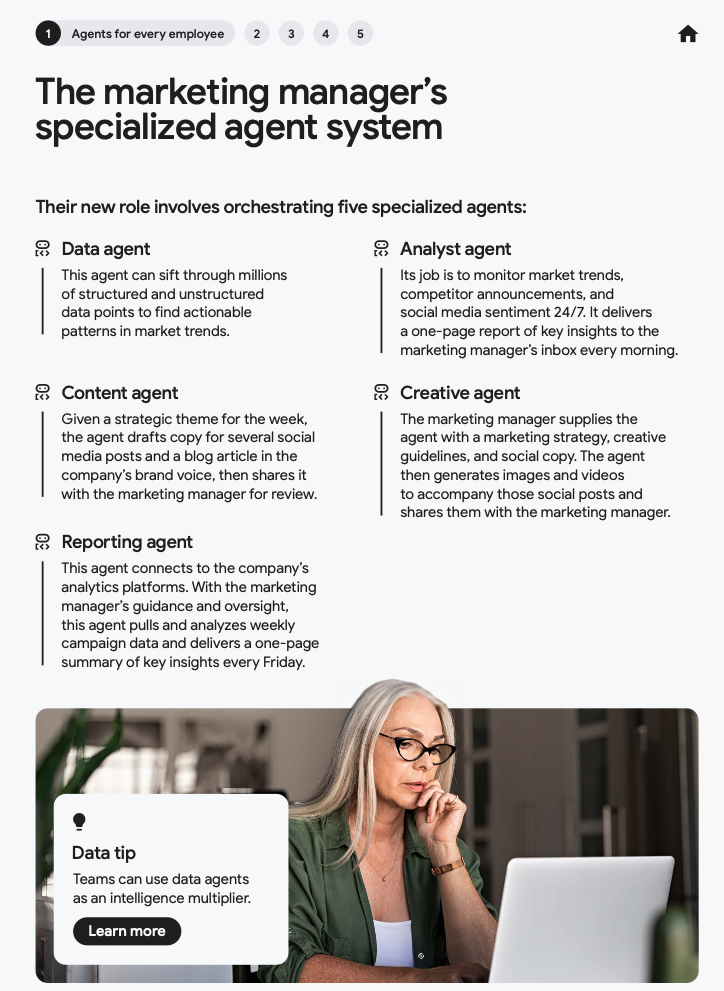 Главный тезис Google: мы переходим от роли «создателя» к роли «оркестратора» (orchestrator). В новой модели сотрудник не занимается каждой задачей сам, а делегирует их группе специализированных агентов. Его функция - поставить цель, определить стратегию, выбрать подходящие агентские инструменты и проверить результат.