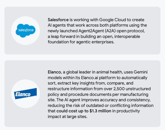 Организации, внедряющие такие системы, уже видят результат: 88 % ранних адоптеров отмечают положительный ROI хотя бы для одного сценария использования. Salesforce и Google строят совместных агентов по протоколу A2A, а Elanco использует Gemini для обработки тысяч документов – это уменьшило риск ошибок и повысило производительность.