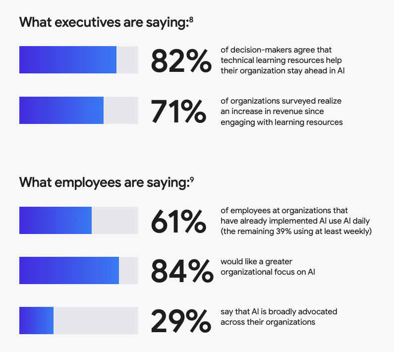 Поэтому самый важный ресурс – обучение. Исследование Google/Ipsos показывает, что 82 % руководителей считают технические курсы ключевым фактором для опережения конкурентов, 71 % компаний отметили рост дохода после инвестиций в обучение, а 84 % сотрудников хотят большего внимания к AI.
