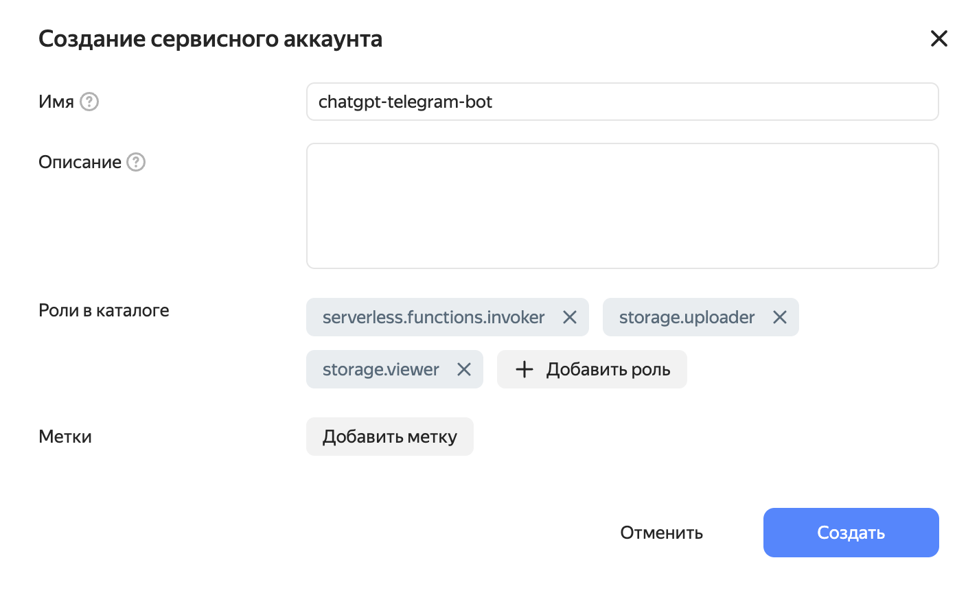 В консоли Яндекс Облака переходим в Сервисные аккаунты и создаём новый. Присваиваем роли: