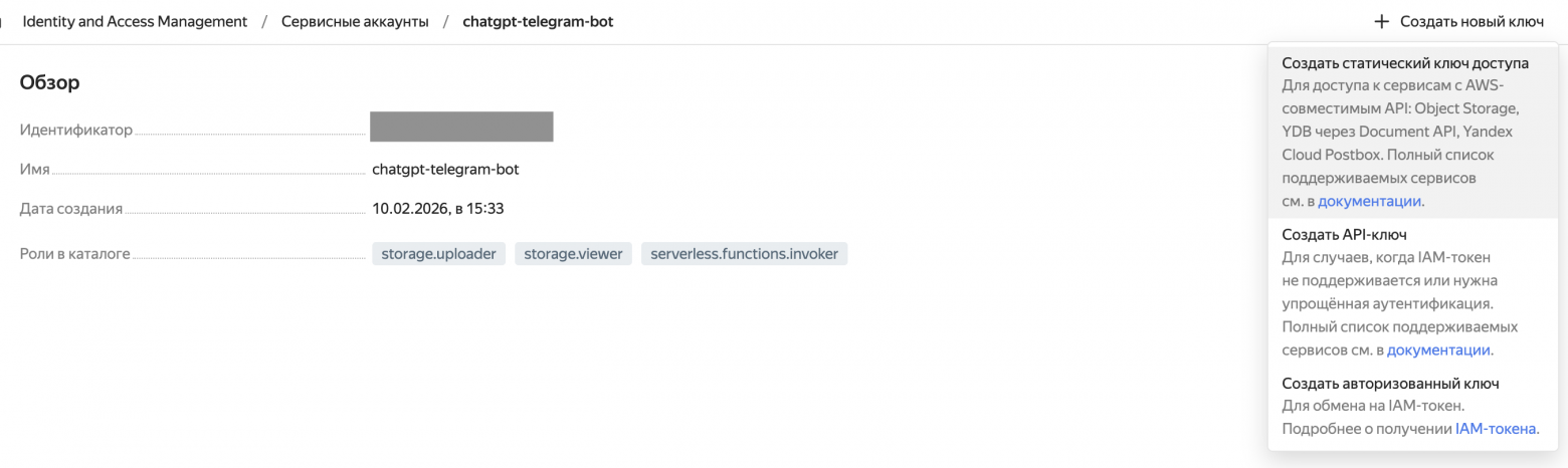 После создания переходим в аккаунт и создаём статический ключ доступа. Сохраняем Key ID и Secret.