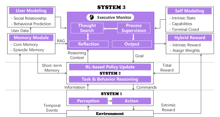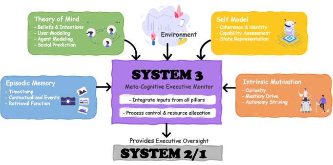 Исследователи предложили архитектуру «Система-3». Если Система-1 действует, Система-2 рассуждает, то Система-3 следит за самим мышлением: хранит автобиографию, ставит долгосрочные цели, проверяет себя и формирует внутреннюю мотивацию.