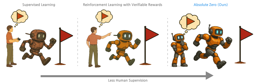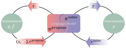 Absolute Zero Reasoner работает без внешних данных. Модель играет две роли: proposer создаёт задачу, solver её решает. Среда Python строго проверяет корректность. Если решение верно — начисляется награда.