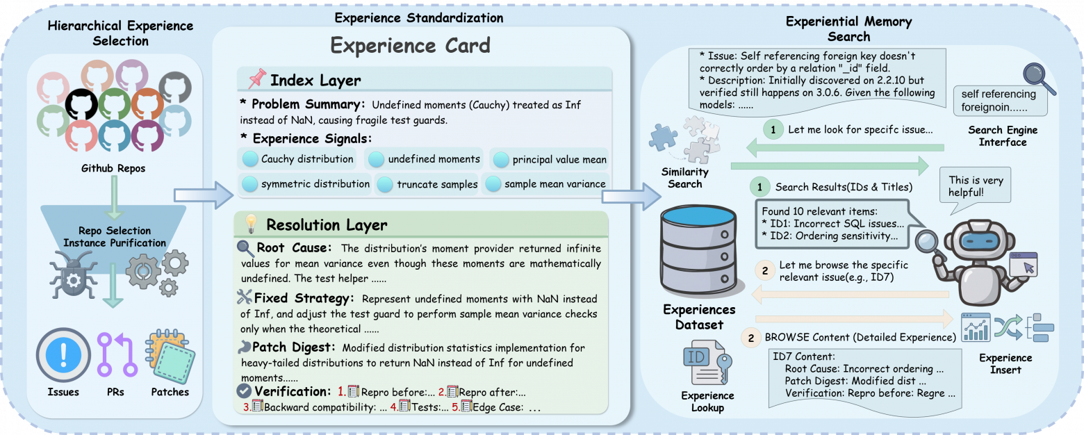 Исследователи предложили превратить GitHub в структурированную память. Реальные случаи исправлений преобразуются в «карточки опыта»: нормализованные симптомы, тип ошибки, сигналы, контекст — и отдельно логика решения, первопричина и стратегия фикса.