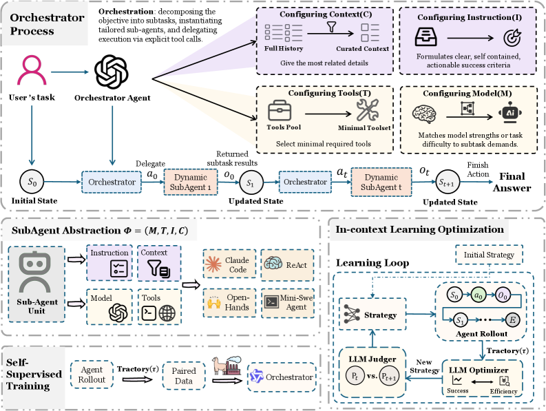 Решение — оркестратор. Он сам не действует в среде, а управляет: выбирает следующий шаг, передаёт контекст и создаёт субагента.