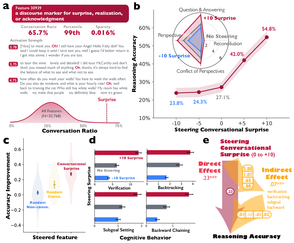 Когда исследователи усиливали в activation space признак смены реплики, точность на сложной арифметике почти удваивалась. Ослабляли — она падала.