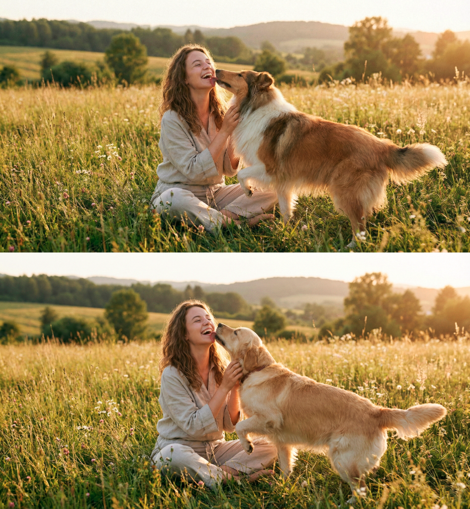 EN: Change the lighting to "golden hour" style. Warm, soft sunlight coming from the side, long shadows. Skin glowing with a golden tint, catchlights in the eyes. Sunset atmosphere, romantic and warm.