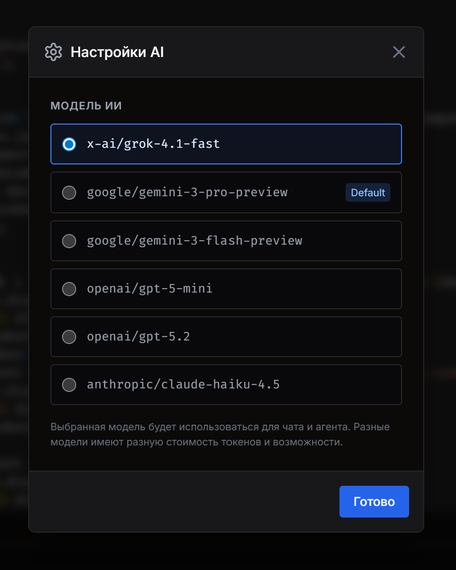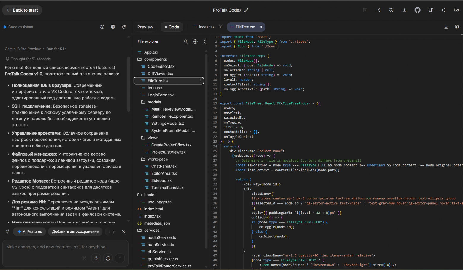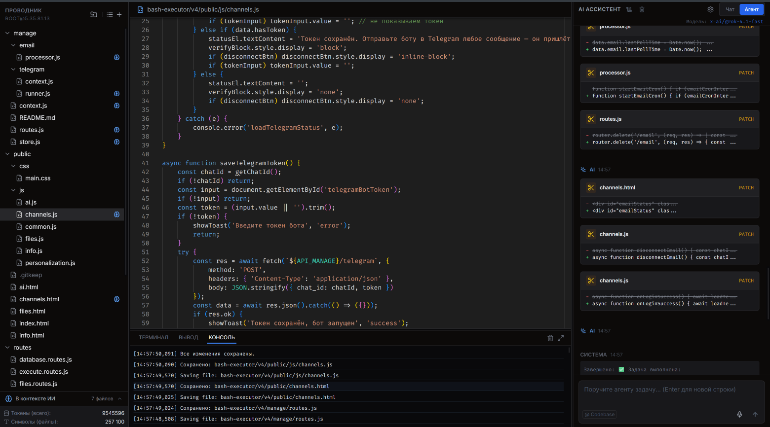 Прежде чем рассказывать о процессе, покажу, что получилось на выходе. Это браузерная IDE с подключением к удалённому серверу через SSH, агентом на базе LLM и набором возможностей, который удивил даже меня.