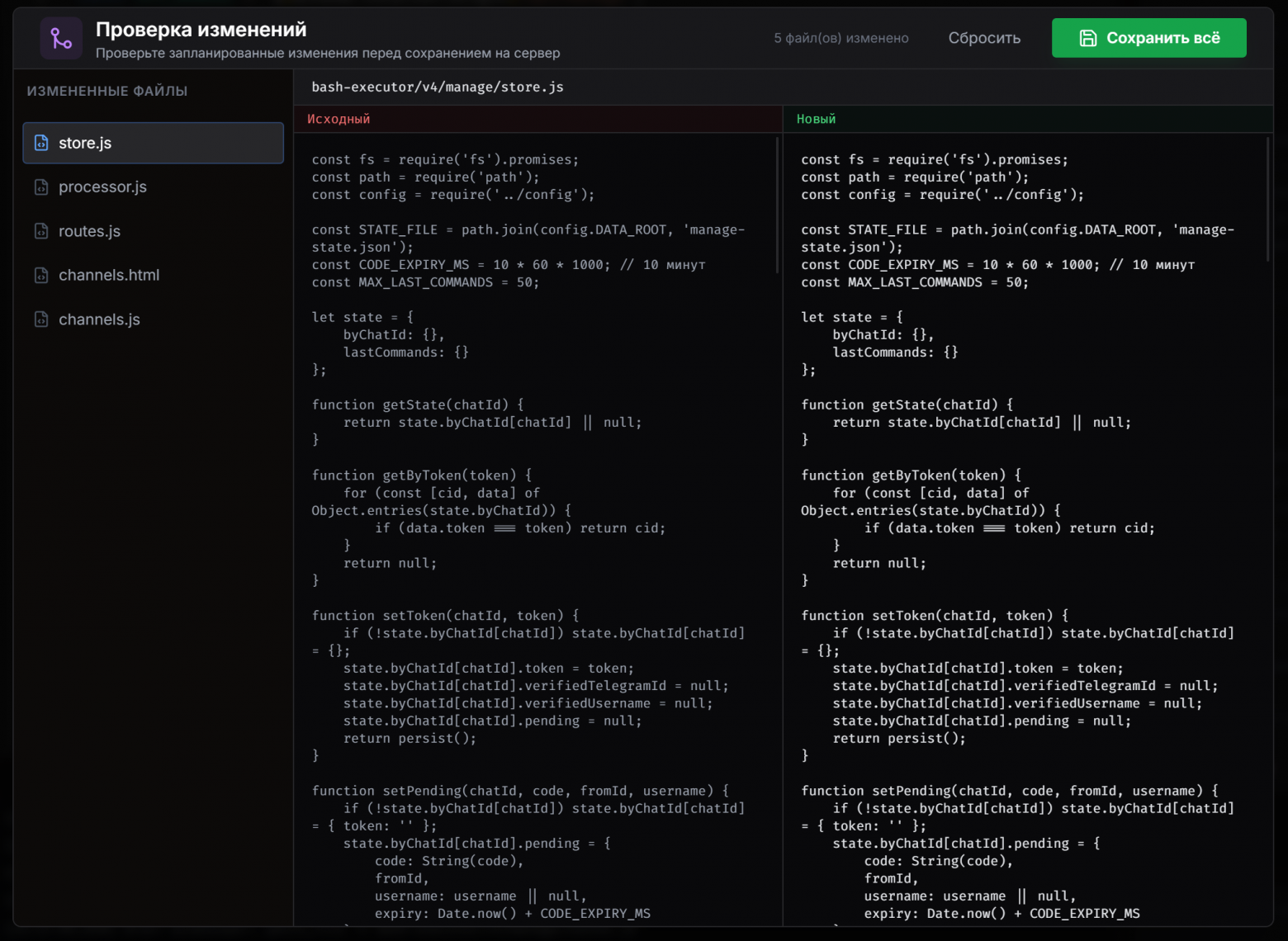 Visual Diff Viewer — встроенное сравнение версий прямо в редакторе. Зелёное — добавлено, красное — удалено. Можно посмотреть на каждый файл до того, как нажать "Сохранить".