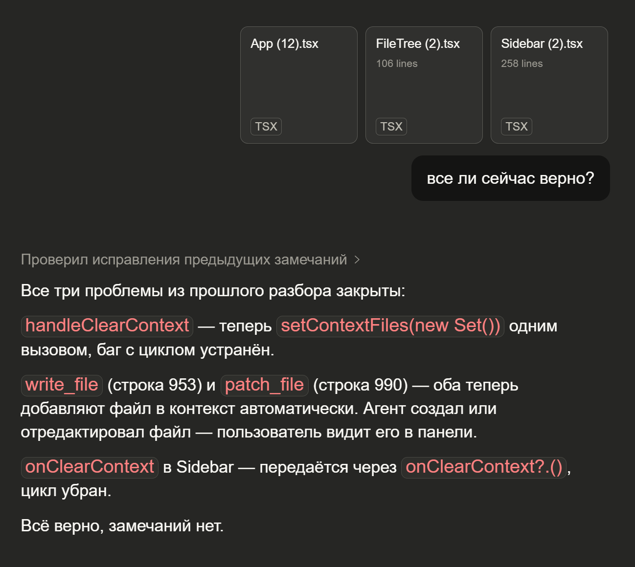 Но параллельно я делал кое-что ещё. После каждого значимого изменения я открывал Claude Chat и скидывал ему изменённые файлы. Не для того, чтобы он что-то переписывал — а чтобы он делал концептуальное ревью: правильно ли архитектурное решение, нет ли логических ошибок, что стоит улучшить дальше.