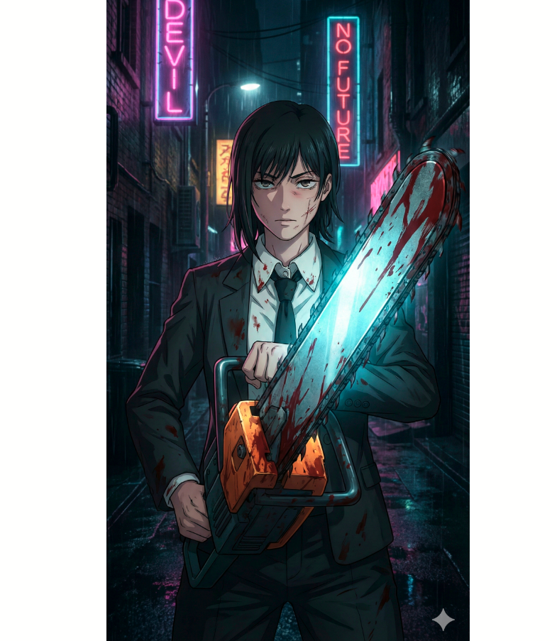 Нарисуй взрослого персонажа. Девушка в строгом офисном костюме, белый воротник испачкан. В руках она держит огромную светящуюся бензопилу. На щеке царапина. За ее спиной темный переулок, освещенный мерцающим неоном. Chainsaw Man anime style, MAPPA aesthetic, gritty and dark, bloodstains, cinematic composition, intense stare, aspect ratio 9:16
