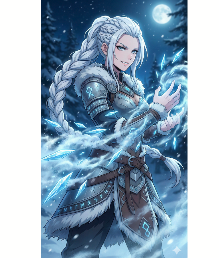 Создай персонажа с нуля. Девушка-воин с длинными белыми волосами, заплетенными в сложную косу. На лице легкая уверенная полуулыбка. Она использует магию льда: вокруг ее рук закручиваются острые ледяные осколки и густой морозный туман. Ночной зимний лес на фоне. Ufotable style, Fate series aesthetic, glowing ice magic, particle effects, moonlight shining, cinematic rim light, highly detailed character design, aspect ratio 9:16