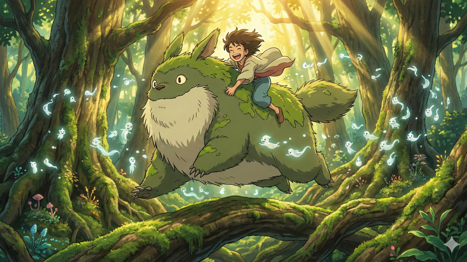 Сгенерируй динамичную сказочную сцену. Огромный пушистый лесной дух бежит по густому древнему лесу, перепрыгивая через поросшие мхом гигантские корни деревьев. На его спине крепко держится подросток, его одежда и волосы развеваются на ветру, а на лице сияет улыбка от невероятной скорости и восторга. Вокруг них в воздухе кружатся маленькие полупрозрачные светящиеся существа. Яркие золотистые лучи солнца пробиваются сквозь густую листву вековых дубов, создавая волшебную атмосферу. Studio Ghibli style, Hayao Miyazaki aesthetic, dynamic action shot, running through ancient magical forest, glowing spirits, sunbeams filtering through trees, vibrant green colors, warm nostalgic lighting, traditional animation art, masterpiece, aspect ratio 16:9