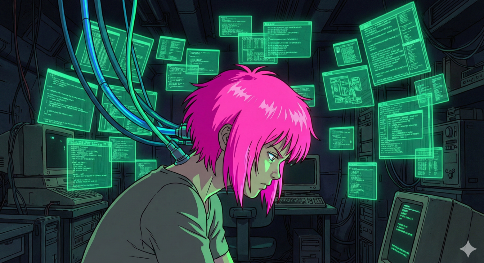 Создай персонажа с нуля. Девушка-хакер с короткими неоново-розовыми волосами. К задней части ее шеи подключены толстые светящиеся кабели. Она сидит в темной комнате перед десятками голографических мониторов, освещающих ее лицо зеленым светом. Akira anime style, retro cyberpunk, glowing wires, holographic screens, highly detailed tech equipment, aspect ratio 16:9