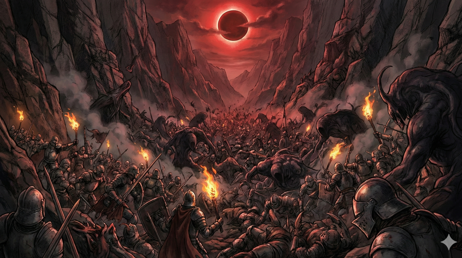 Создай масштабную батальную сцену. Армия рыцарей с факелами сдерживает натиск гигантских теневых чудовищ в узком горном ущелье. В небе висит кроваво-красное затмение, заливая все поле боя зловещим багровым светом. Seinen anime style, massive dark fantasy battle, horrific monsters, red eclipse, grim and gritty, masterpiece illustration, aspect ratio 16:9