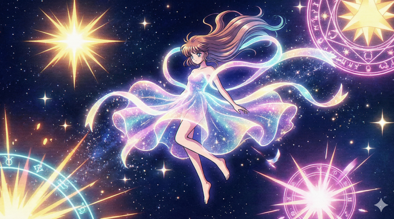 Сгенерируй сцену магической трансформации. Девушка парит в невесомости на фоне бесконечного звездного неба. Вокруг ее тела закручиваются сияющие ленты света, превращаясь в платье. Ретро-анимация с плотными тенями и характерными цветами 90-х. 90s anime transformation sequence, glowing magical ribbons, starry background, retro cel shading, vintage anime screenshot, aspect ratio 16:9