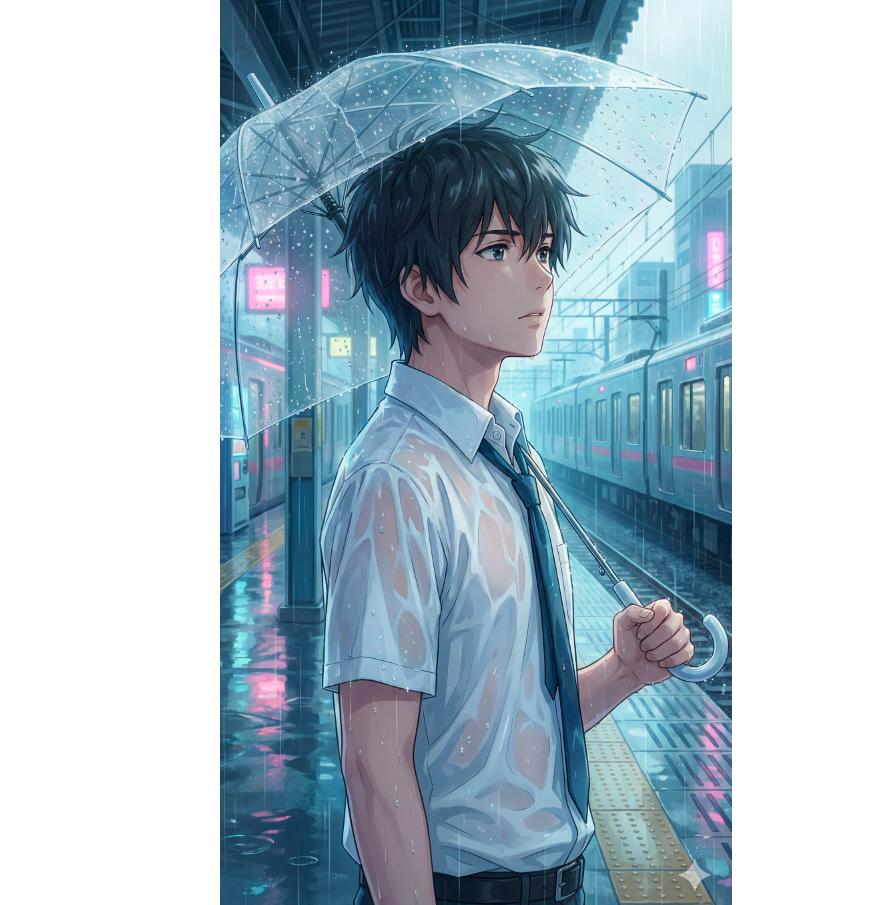 Создай персонажа с нуля. Молодой парень с растрепанными темными волосами, в белой школьной рубашке и ослабленном галстуке. Он стоит на перроне железнодорожной станции под проливным дождем, держа в руках прозрачный зонт. Взгляд направлен вдаль, выражение лица задумчивое. Makoto Shinkai style, Weathering with You aesthetic, hyper-detailed rain drops, reflections in puddles, soft cool lighting, masterpiece, character portrait, aspect ratio 9:16