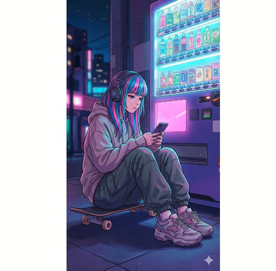 Нарисуй нового персонажа. Девушка-скейтбордистка с цветными прядями в волосах. На ней оверсайз худи, широкие штаны и массивные кроссовки. Она сидит на скейте возле неонового автомата с напитками и слушает музыку в больших накладных наушниках. Anime lo-fi aesthetic, streetwear fashion, neon vending machine, oversized clothing, chill vibes, aspect ratio 9:16