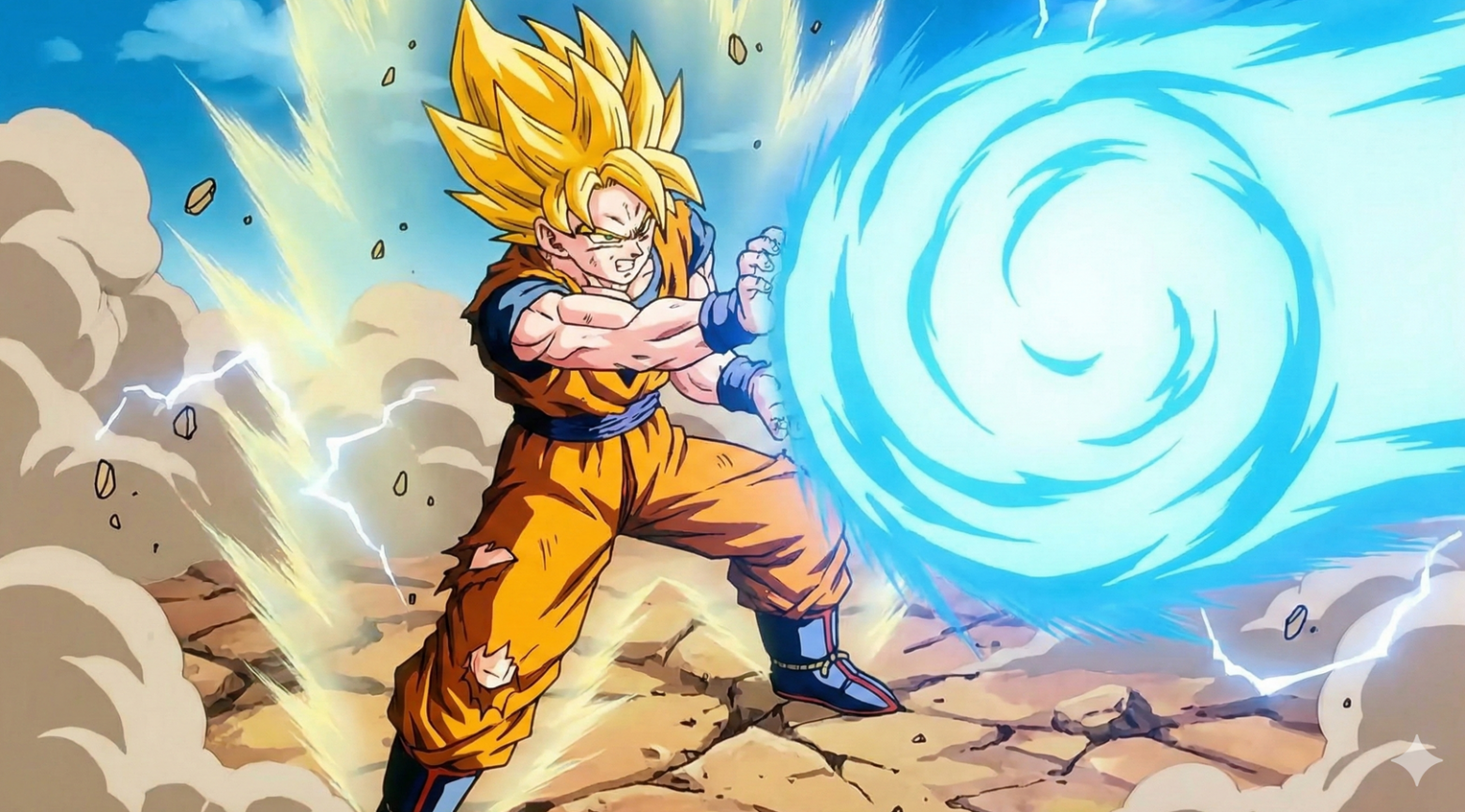 Сгенерируй персонажа с нуля. Парень с колючими светлыми волосами в оранжевом боевом костюме. Он стоит в боевой стойке, собирая в ладонях огромный светящийся голубой шар энергии. Земля под его ногами трескается от напряжения, вокруг летают мелкие камни. Dragon Ball anime style, shounen action, intense energy aura, glowing ki ball, dynamic pose, cracked ground, aspect ratio 16:9