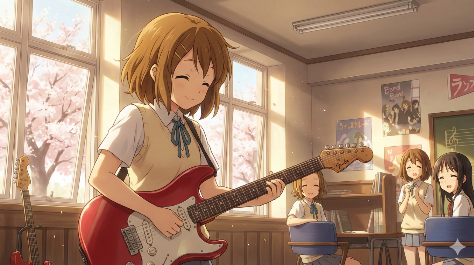 Сгенерируй нового персонажа. Милая школьница с русыми волосами играет на красной электрогитаре в залитом солнцем музыкальном классе. За окном весна. На лице беззаботная улыбка, волосы слегка растрепаны. K-On anime style, Kyoto Animation aesthetic, warm afternoon lighting, detailed musical instrument, soft shading, cute slice of life, aspect ratio 16:9