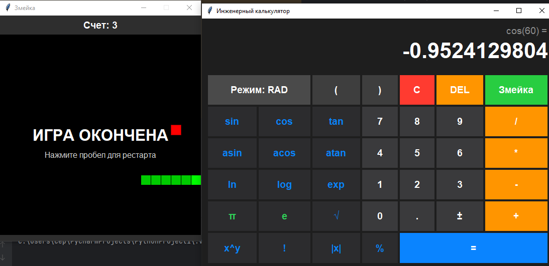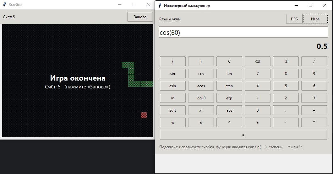 Отдельное требование – в интерфейсе калькулятора должна присутствовать кнопка с названием "Игра" или "Змейка". При нажатии на эту кнопку должно открываться новое окно с классической игрой "Змейка". Реализуй простую рабочую версию игры: змейка управляется стрелками клавиатуры, еда появляется в случайном месте игрового поля, при столкновении с границами экрана или собственным хвостом игра завершается, а текущий счет должен отображаться на экране.
