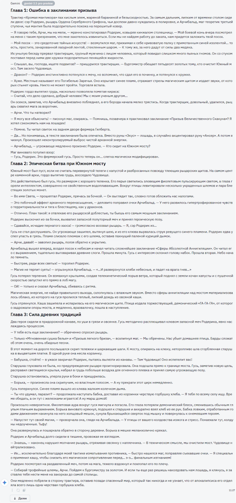 Gemini, как всегда, краток. Его рассказ по сравнению с ChatGPT выглядит как одна глава.Хотя на этом пожалуй минусы и закончились. Юмор и абсурд ситуации мне тут понравился больше, как и сам процесс чтения. Максимальный балл в копилку модели.