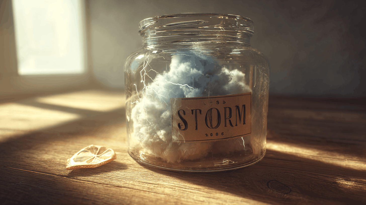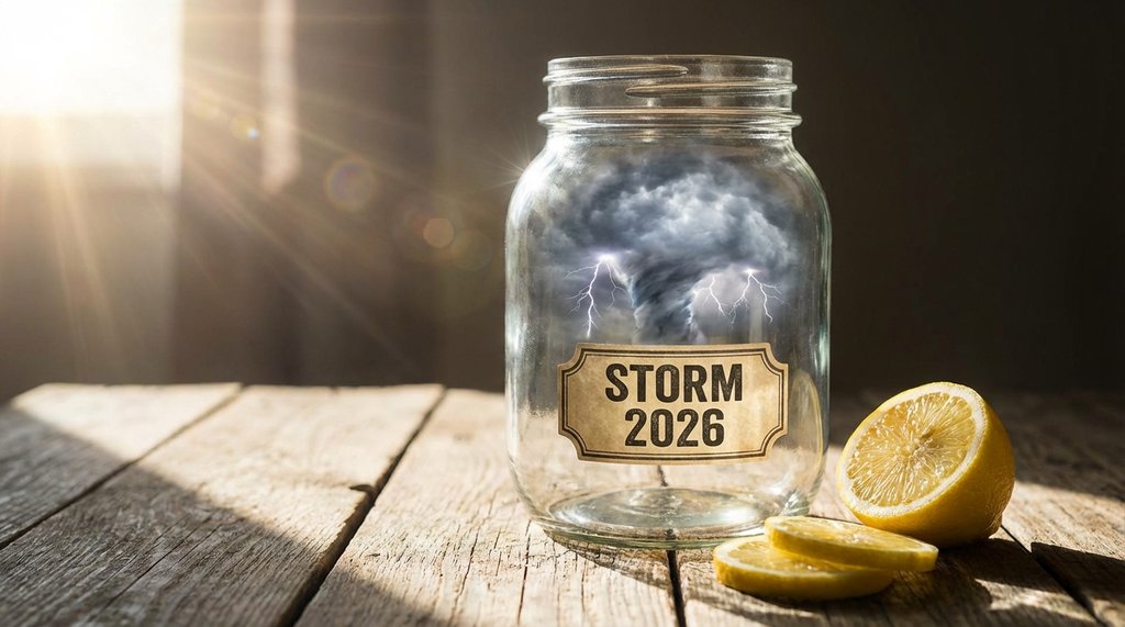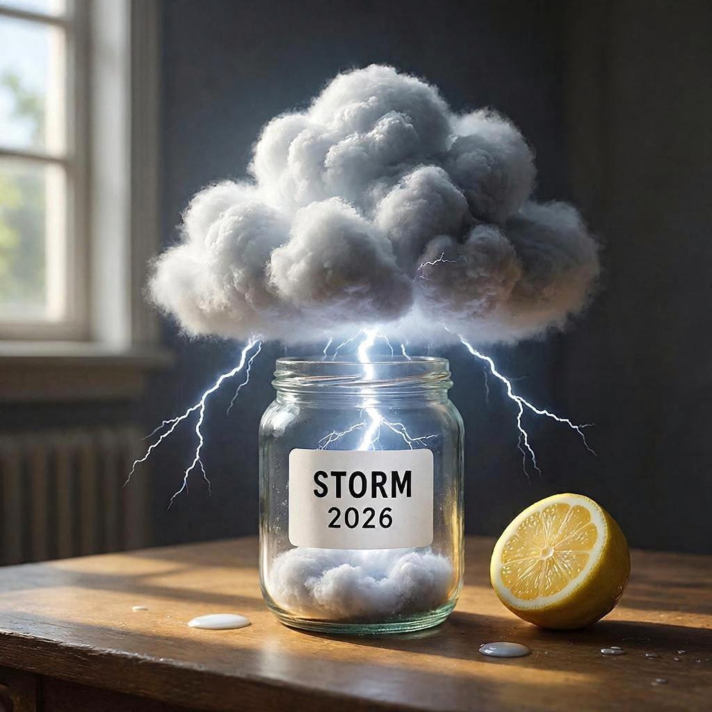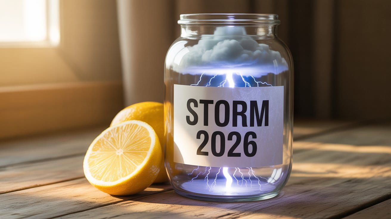 Прозрачная стеклянная банка стоит на деревянном столе. Внутри банки находится пушистое грозовое облако с молниями. На банке прикреплена бирка с четкой надписью «STORM 2026». Рядом с банкой лежит разрезанный лимон. Солнечный свет падает слева.
