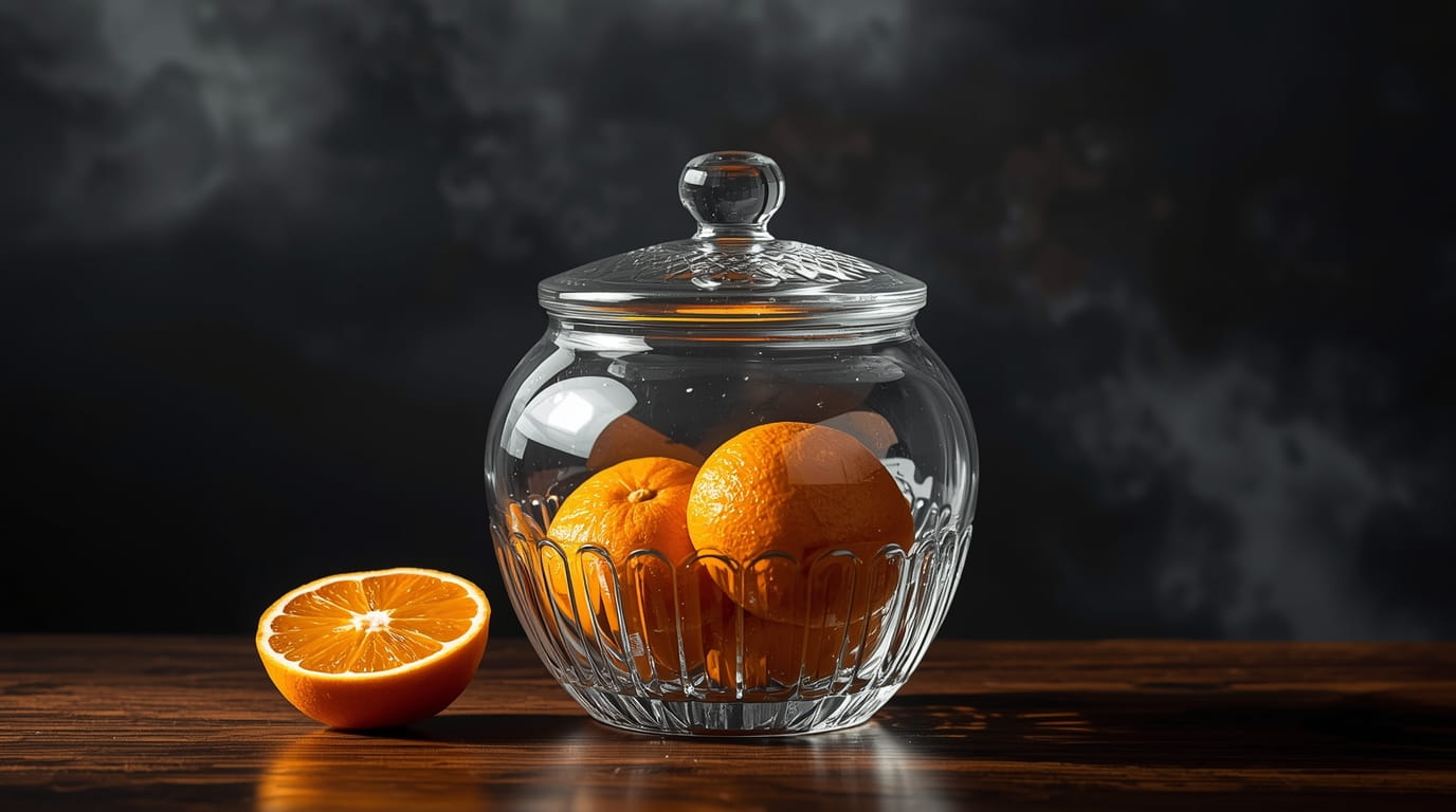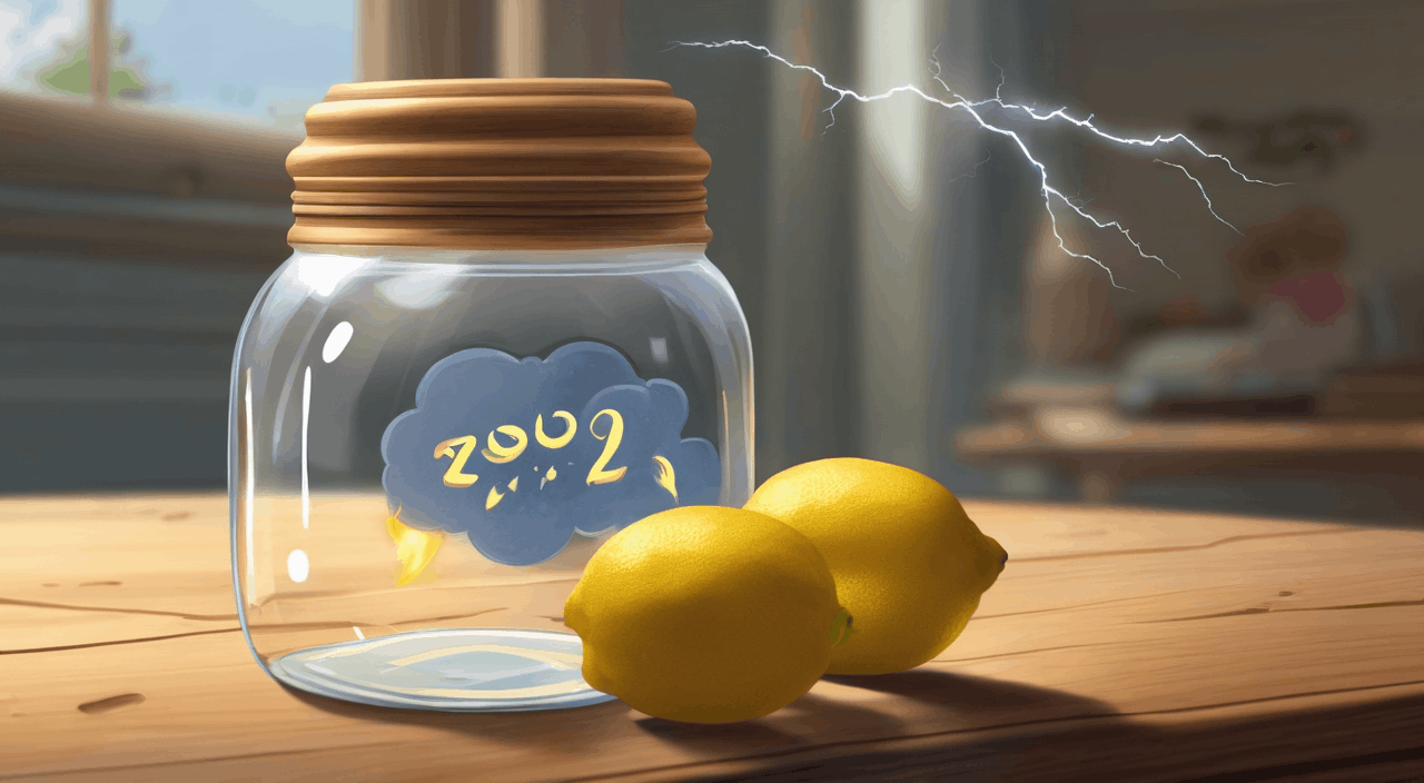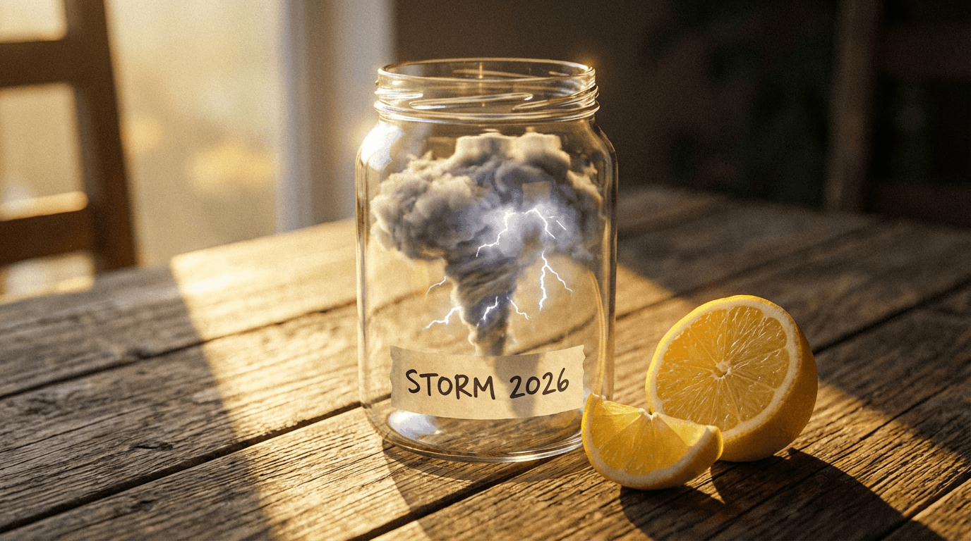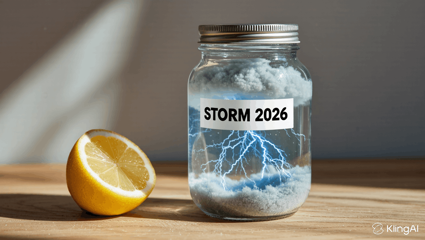 Прозрачная стеклянная банка стоит на деревянном столе. Внутри банки находится пушистое грозовое облако с молниями. На банке прикреплена бирка с четкой надписью «STORM 2026». Рядом с банкой лежит разрезанный лимон. Солнечный свет падает слева.