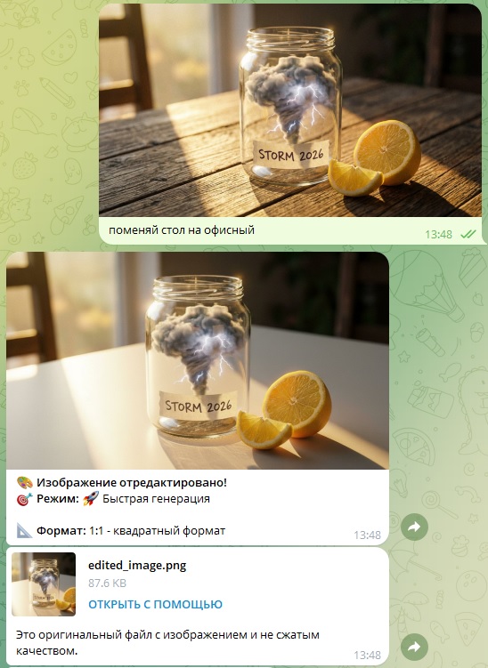 Бот понимает контекст и исправляет именно этот элемент, сохраняя остальное изображение. Это как стоять за спиной у дизайнера и говорить ему: «А вот тут подправь».