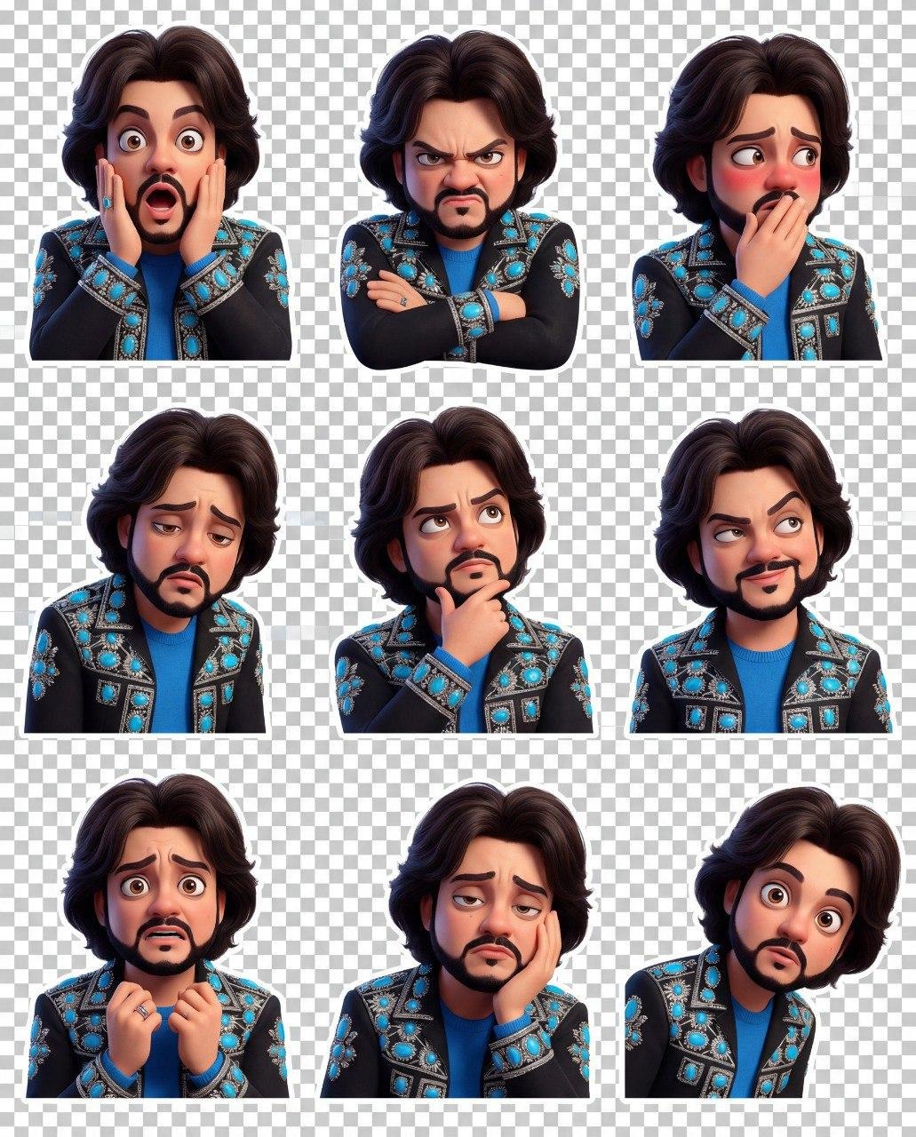 Используя загруженное селфи как единственный и исключительный источник для лица, создайте набор стикеров персонажа в стиле Pixar 3D. Персонаж должен быть чётко узнаваемым как человек с селфи.