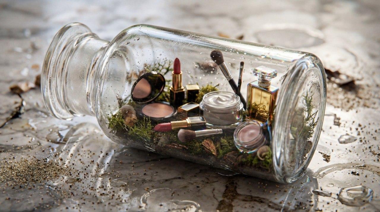 Создай высокодетализированный рекламный визуал премиального уровня: горизонтально расположенный прозрачный стеклянный сосуд, внутри которого находится миниатюрная сцена SCENE CONTENT, выполненная в формате реалистичной диорамы.