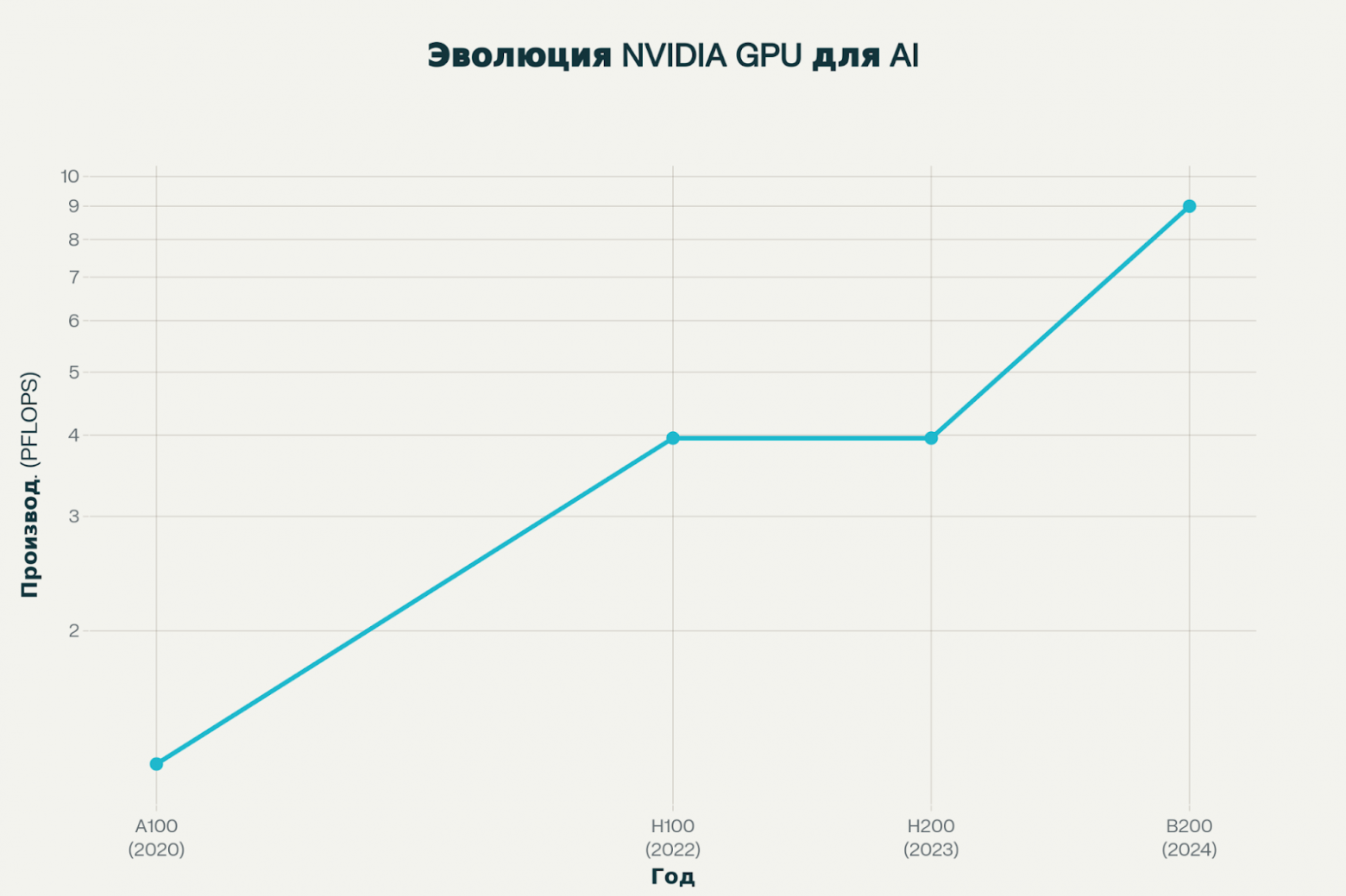 Архитектура Hopper с GPU H100, представленная в 2022 году, совершила качественный скачок в производительности, обеспечивая 1000 терафлопс в формате FP8. Это 30-кратное ускорение по сравнению с предыдущим поколением для больших языковых моделей. H100 стал доминирующим решением для обучения самых продвинутых моделей, включая GPT-4, для которого потребовалось порядка 25,000-30,000 GPU.​