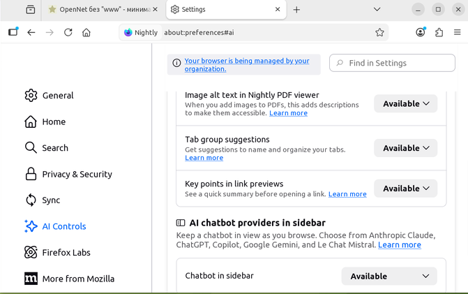 в кодовую базу добавлена настройка для полного отключения всех возможностей, связанных с ИИ. На странице аbout:config появился параметр «browser.preferences.aiControls», после активации которого на странице с настройками появляется секция для управления использованием AI. На странице можно разом отключить все ИИ‑функции или выборочно активировать только необходимую функциональность;