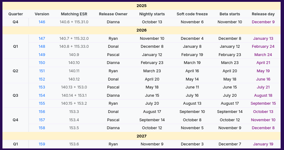 Проект Firefox 138 вышел в апреле 2025 года. Версия Firefox 139.0 опубликована в мае 2025 года. Релиз Firefox 140 ESR произошёл в конце июня 2025 года. Версия ESR (Extended Support Release) означает, что она будет поддерживаться в течение следующих нескольких лет с исправлениями безопасности через регулярные точечные выпуски. Версия Firefox 141.0 появилась 22 июля 2025 года. Firefox 142.0 вышел в августе 2025 года, в этом релизе позволено браузерным расширениям/дополнениям использовать LLM‑модели на основе ИИ. Версия Firefox 143.0 вышла в сентябре 2025 года. Сборка Firefox 144.0 состоялась в октябре 2025 года. Firefox 145.0 (в нём прекращена поддержка 32-разрядных сборок для Linux) вышел в ноябре 2025 года. Выпуск Firefox 146.0 случился 9 декабря 2025 года. Релиз Firefox 147.0 произошёл в январе 2026 года.