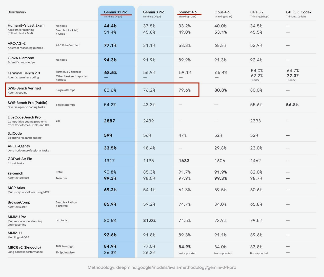 В официальной таблице Gemini 3.1 Pro указано: SWE‑bench Verified (single attempt) - 80.6%, а у Sonnet 4.6 - 79.6% в сопоставимом режиме. Разница тут минимальная, так что для реальных команд обычно важнее цена и стабильность, чем еще один процент по этому бенчмарку.