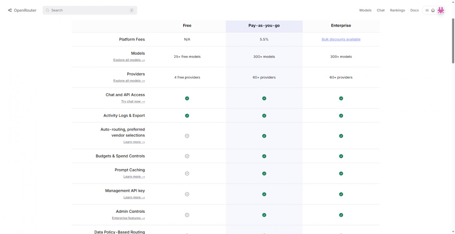 OpenRouter имеет несколько тарифов: бесплатный, pay-as-you-go и enterprise. Средняя комиссия на платном тарифе для использования модели составляет 5.5% от цены токена оригинального провайдера.