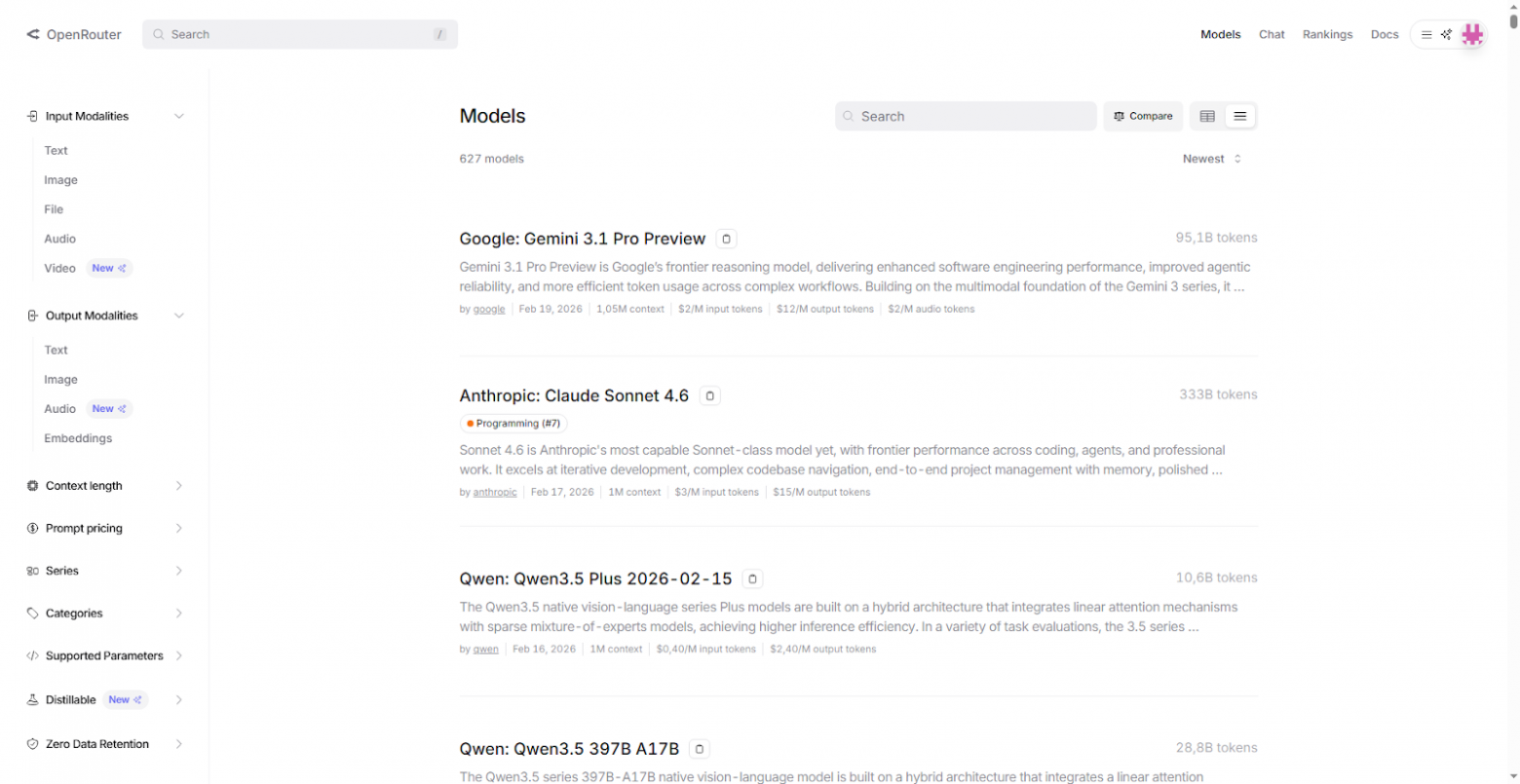Ещё один раздел, где будут различия. OpenRouter даёт возможность использовать огромное количество моделей как с его официального сайта, так и через единый API. На этом список функционала платформы заканчивается.