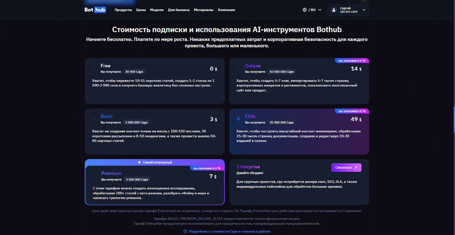 У нас в BotHub аналогичный формат: вы платите только за использование модели. Без каких-либо месячных подписок. Наценка составляет 14% от цены токена на элитном плане OpenRouter. По сути, она не такая уж и большая.