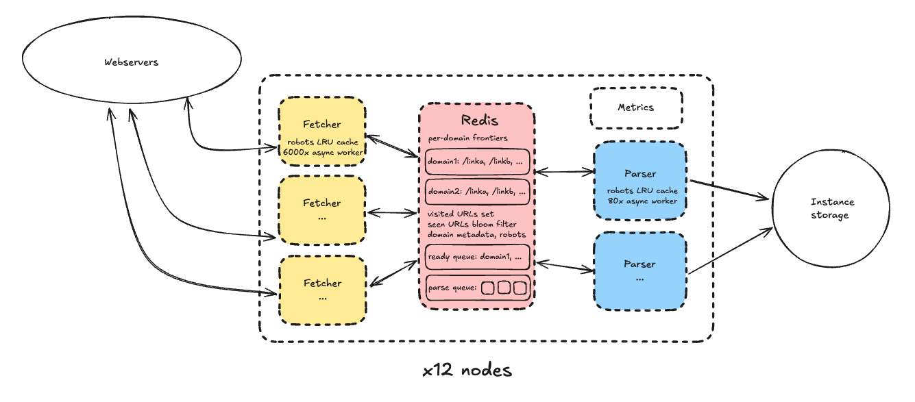 Архитектура, к которой я пришёл в итоге, сильно отличалась от типичного решения для создания краулера из собеседований по проектированию систем, в котором функции (парсинг, загрузка, хранение данных, хранение состояния краулинга) разнесены на отдельные пулы машин. Я же выбрал кластер из десятка высокооптимизированных независимых узлов, каждый из которых включал в себя всю функциональность краулера и обрабатывал шард доменов. Я сделал так, потому что: