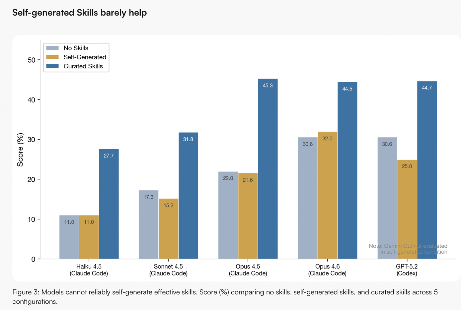 Исследование провели масштабное: больше 100 экспертов, 86 задач из 11 доменов (не только программирование — медицина, финансы, маркетинг), больше 7000 прогонов на 7 моделях. Каждую задачу тестировали в трёх режимах: без скиллов, со скиллами от самой модели и со скиллами от человека.