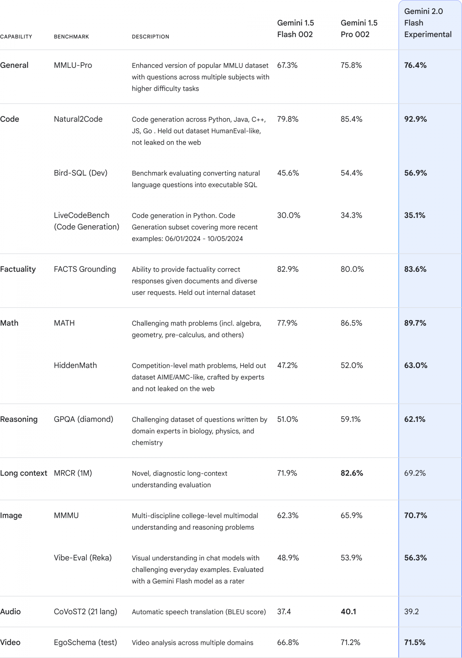 Новая модель, особенно вариант Gemini 2.0 Flash, разработана с расчётом на более высокую скорость и эффективность по сравнению с предшественниками. Она отличается вдвое большей скоростью, чем Gemini 1.5 Pro, сохраняя при этом или даже превосходя её по производительности в ключевых тестах. Эта скорость критически важна для приложений, работающих в режиме реального времени, таких как онлайн-переводчики или интерактивные помощники, где задержка может существенно повлиять на пользовательский опыт. Разработчики теперь могут использовать эту модель для создания приложений с беспрецедентной скоростью отклика, что делает возможными приложения для потоковой передачи аудио и видео в режиме реального времени.