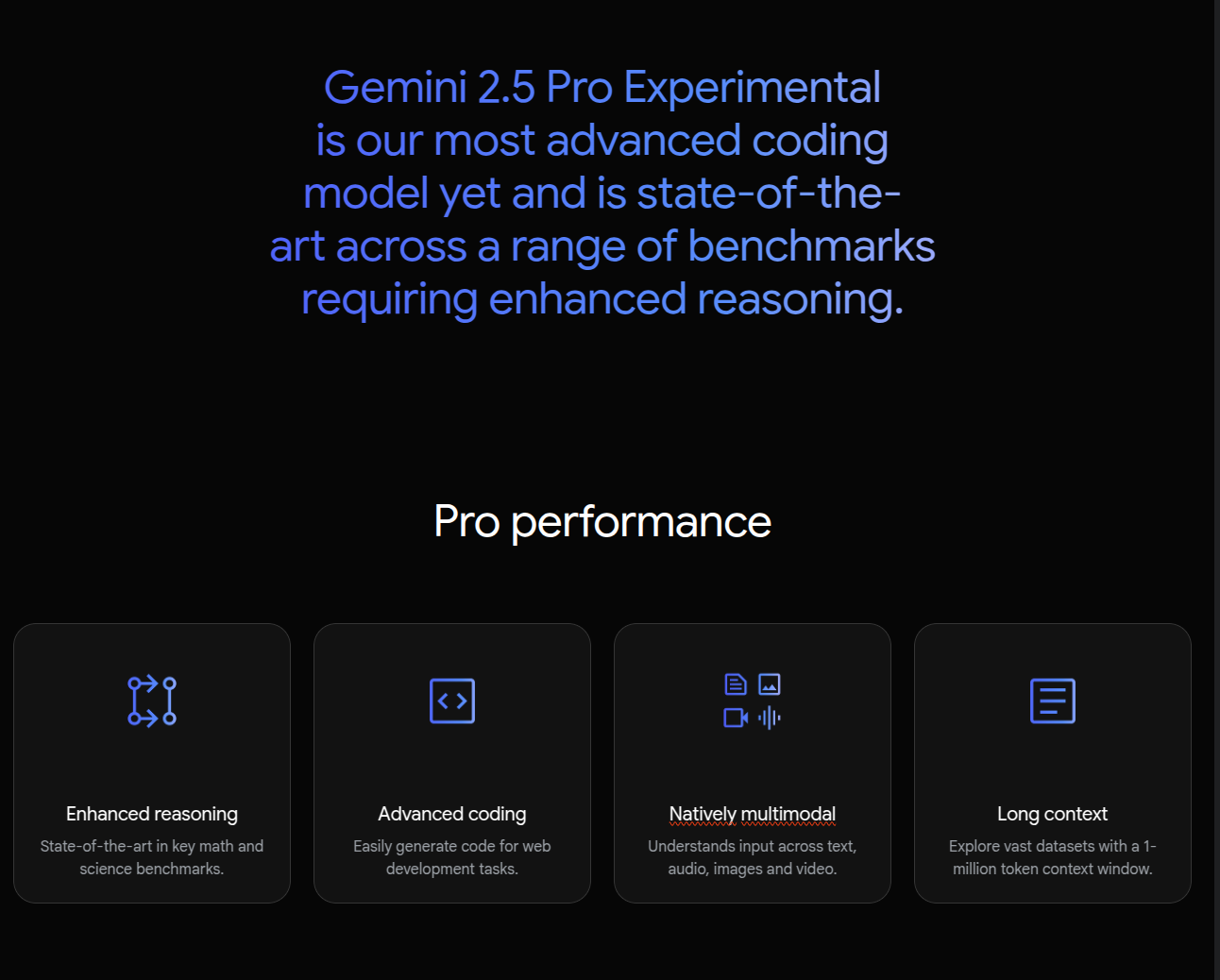Gemini 2.5 Pro — самая продвинутая общедоступная модель искусственного интеллекта от Google (по данным моего исследования начала 2025 года). Она предназначена для решения сложных задач на рассуждение и превосходно понимает и генерирует контент в различных форматах. Google называет её «моделью мышления», подчёркивая её улучшенные логические возможности.