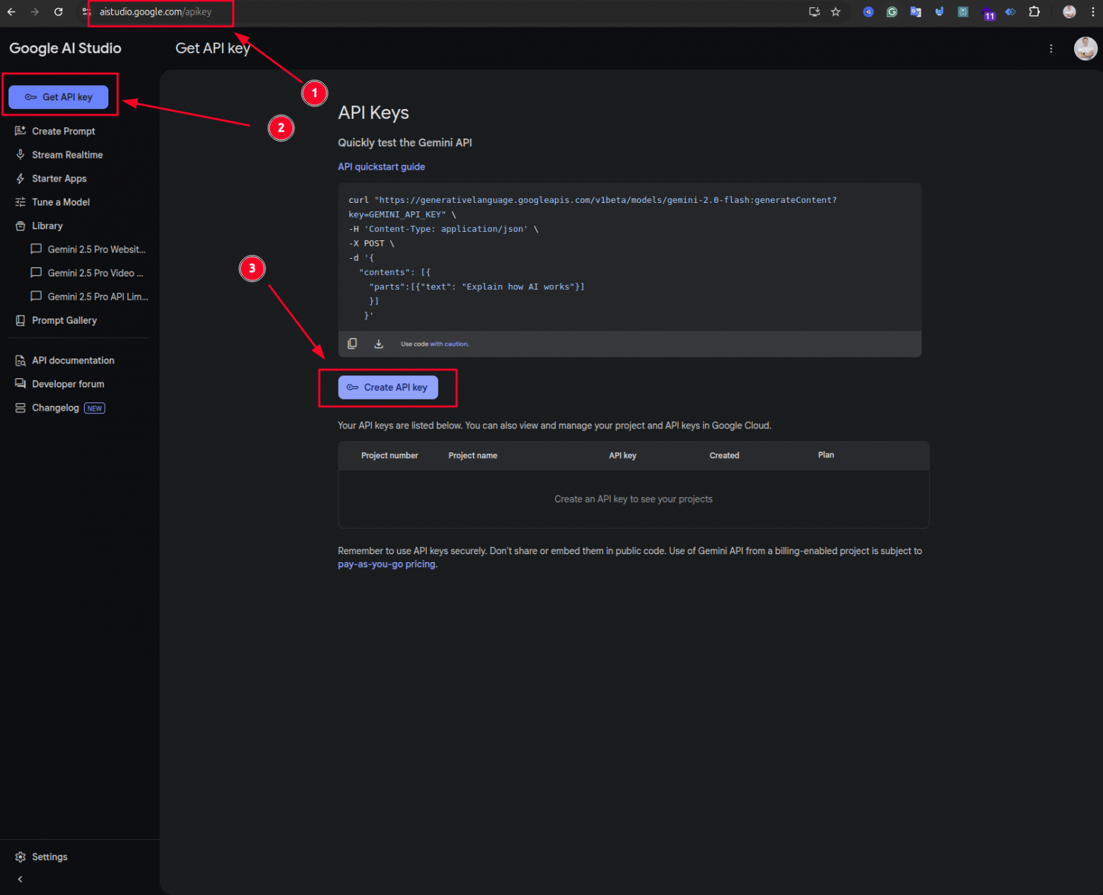 Первый шаг — получение ключа API от Google AI Studio .