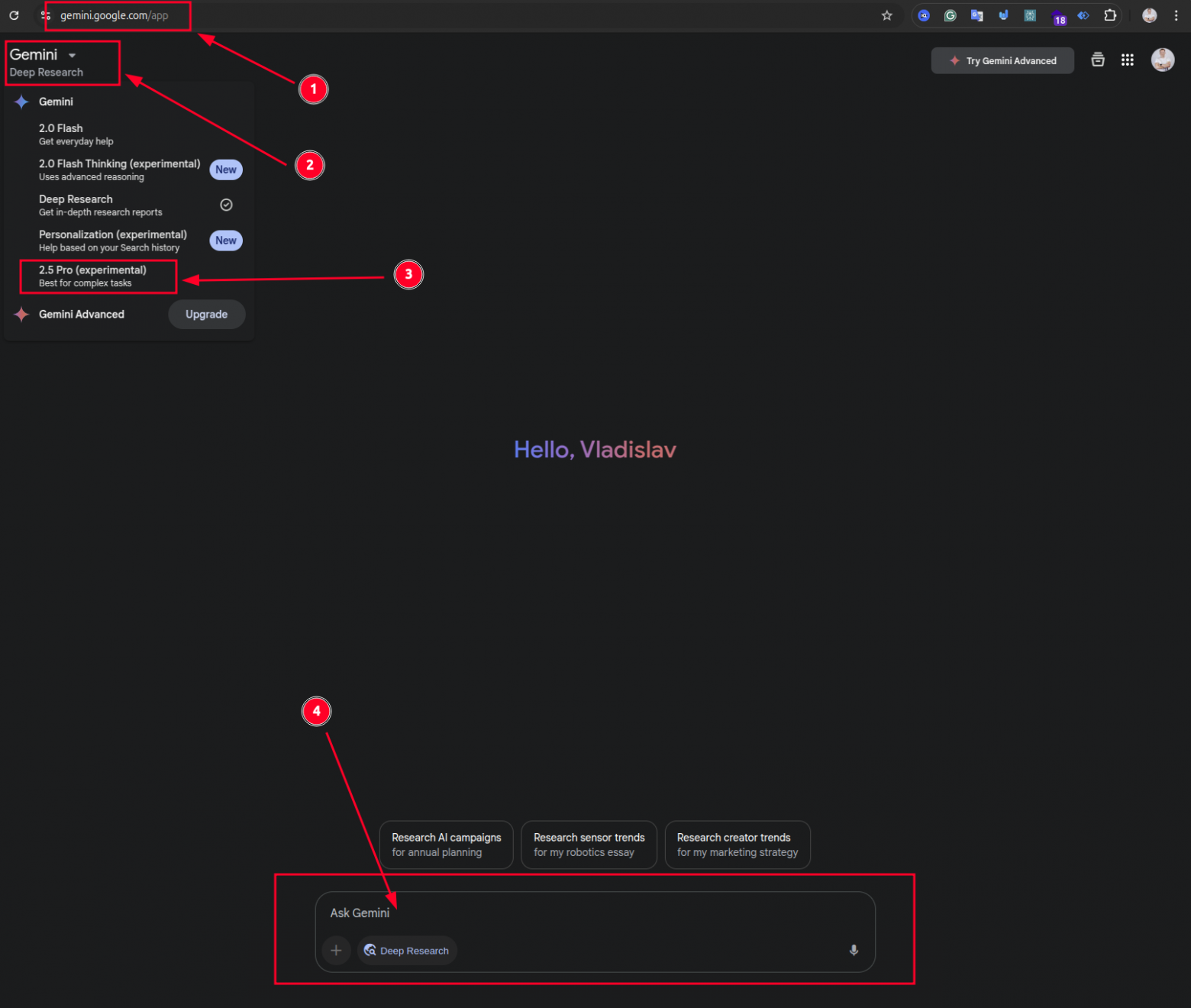 Нажмите на раскрывающийся список моделей (в левом верхнем углу, под «Gemini») и выберите «2.5 Pro (экспериментальная)».