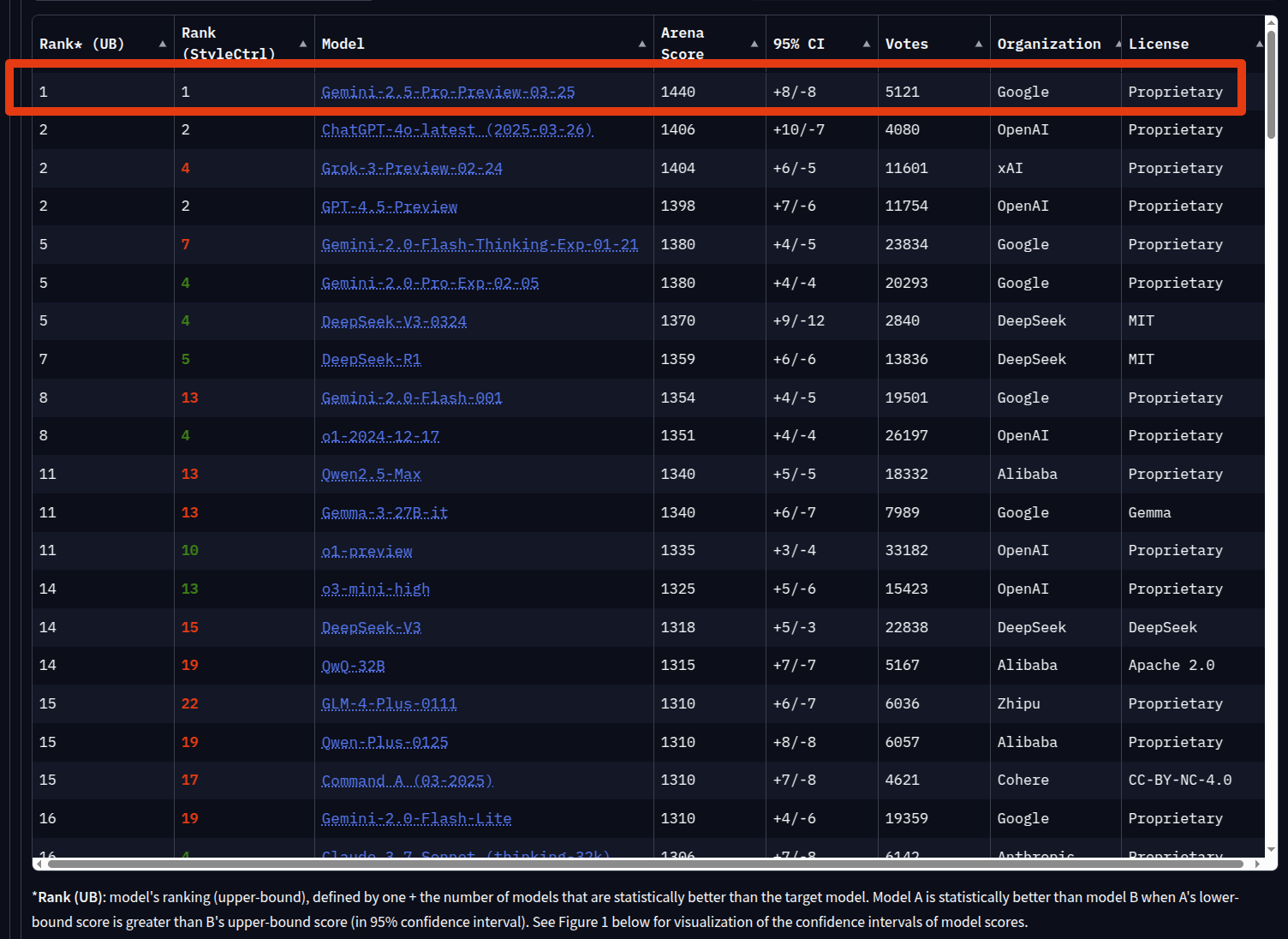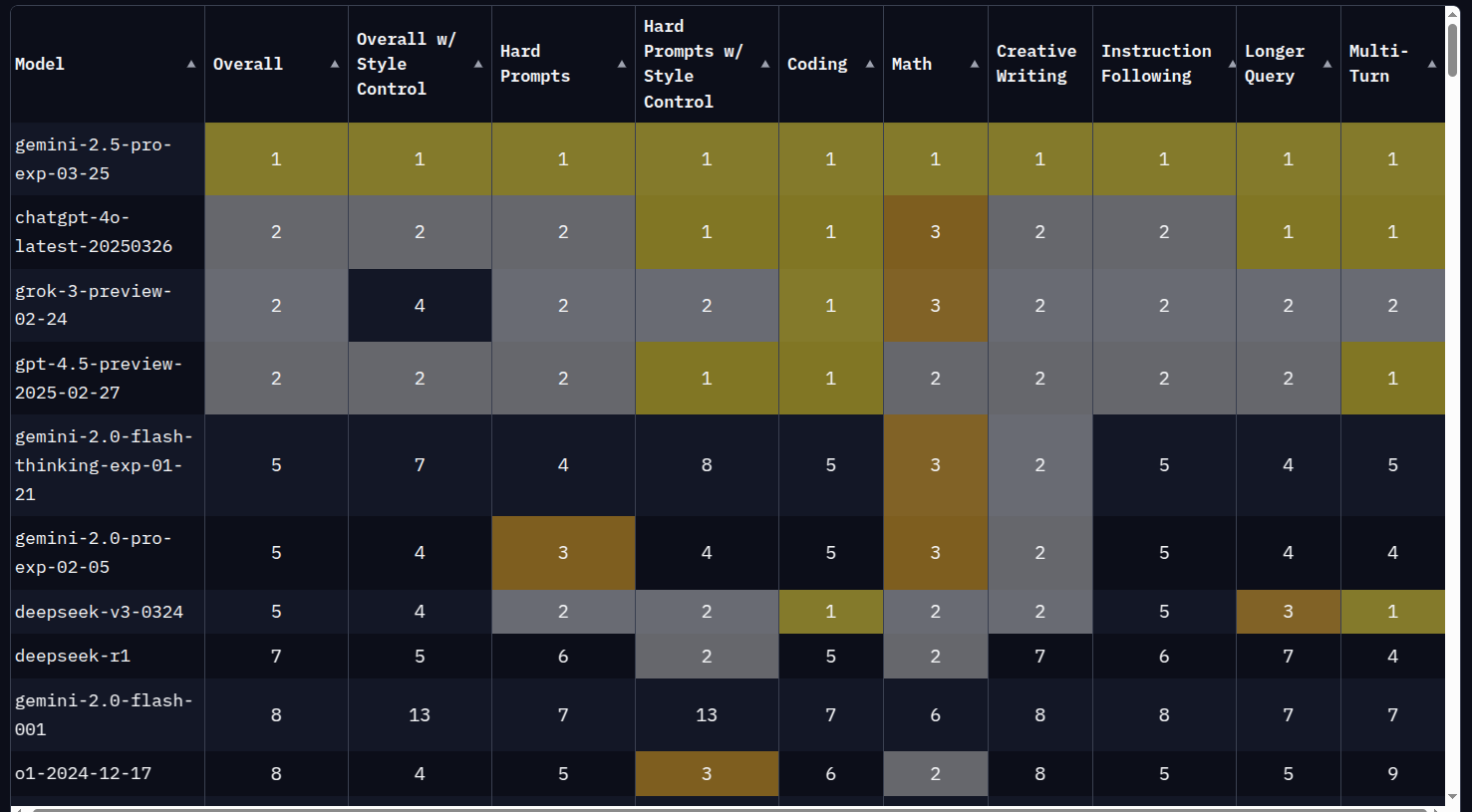 Gemini 2.5 Pro (exp-03-25) превосходит все другие модели во всех категориях , занимая первое место в общем рейтинге и во всех подкатегориях, таких как:
