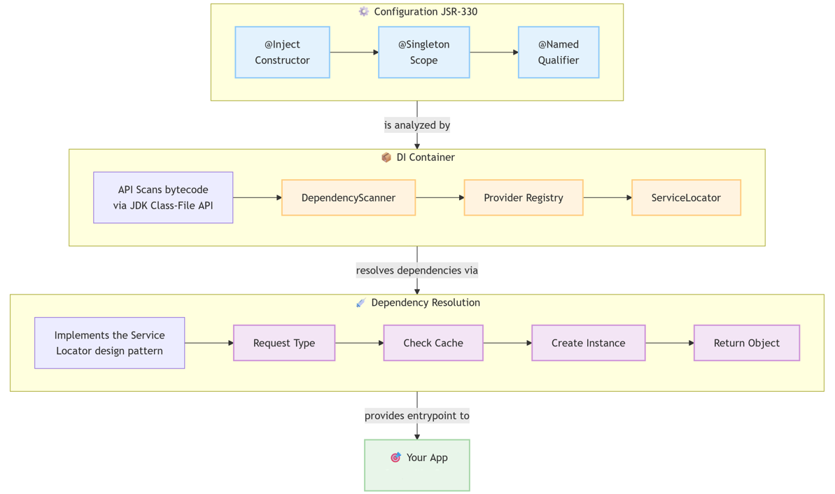 Конфигурация на этапе сборки: Гибкий API Builder используется для настройки DI-контейнера. Этот этап включает сканирование classpath на наличие компонентов, помеченных @Inject, анализ их зависимостей и регистрацию провайдеров (рецептов для создания объектов). Именно здесь проявляется "DI" часть.